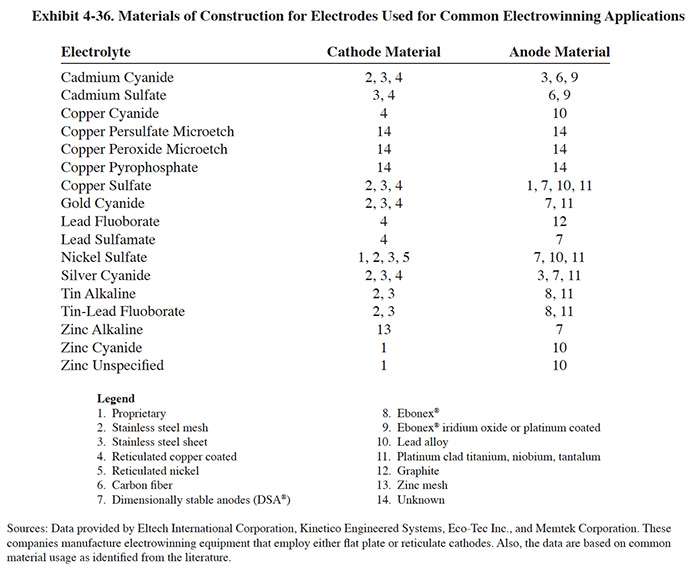 Anode and cathode construction will significantly impact the cost of an electrowinning unit. A list of cathode and anode materials is displayed in Exhibit 4-36. Materials options for a specific application are limited by the peculiarities of the electrolyte being electrowinned and by the manufacturer of the unit. Cost differences can be significant; e.g., ELTECH Systems Corporation offers it's units with either graphite or DSA® (proprietary rare earth coating) anodes. The graphite anodes were quoted in 1993 at $80, while the DSA were $335. For a Retec 25 (26 anodes) this represents a cost difference of $6,630.