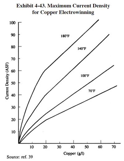Cell amperage is not likely to approach the maximum rectifier output. It is limited by the maximum practical cathode current density for the metallic species being electrowinned which, in turn, is a function of metallic concentration. Thus, in practice, it is the total cathode area and the concentration of metal in the electrolyte that best determines the practical amperage capacity of a unit. Exhibit 4-43 demonstrates the considerable effect of concentration (and temperature) on maximum current density for copper electrowinning; similar curves are to be expected for other metals.